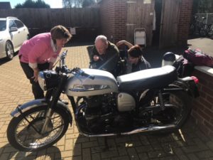 Last month, Amy Roberts, Activities Coordinator at our Maidstone Care Centre in Kent, came up with the lovely idea to see if it was possible to locate a bike similar to one that Gerry had ridden. If Gerry couldn’t go back to his bike anymore, we’d see if we could bring the bike to him. Through family connections, Amy was able to get in touch with a motorcycle enthusiast named Katherine Hook, who was only too delighted to help.