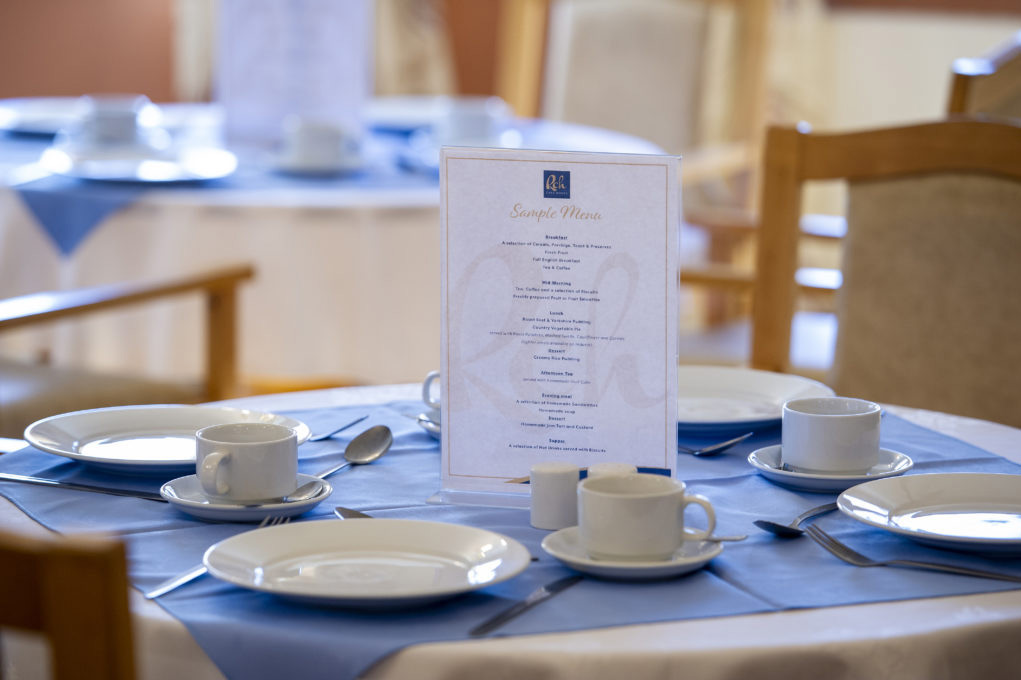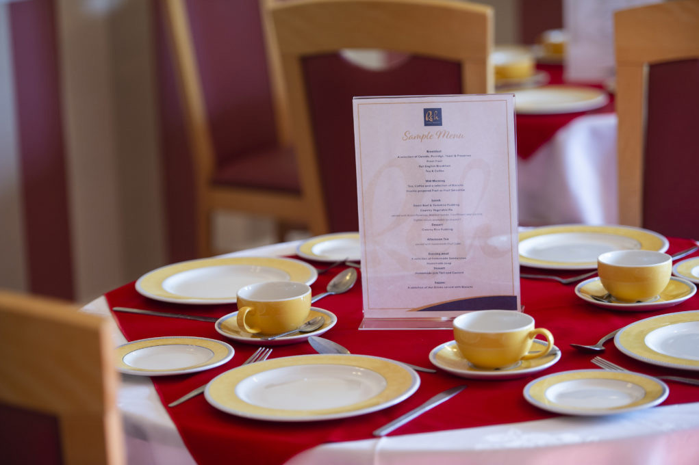 To create a welcoming and pleasant atmosphere for our residents to enjoy their mealtimes, our tables are lovingly laid with crisp table linen, menus clearly showing what’s on offer and cutlery and dinnerware which supports their independence.