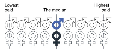Imagine if all employees stood in two lines (male and female) in order of lowest hourly rate of pay to highest. The median gender pay gap is the difference in pay between the female employee in the middle of their line and the male employee in the middle of their line.